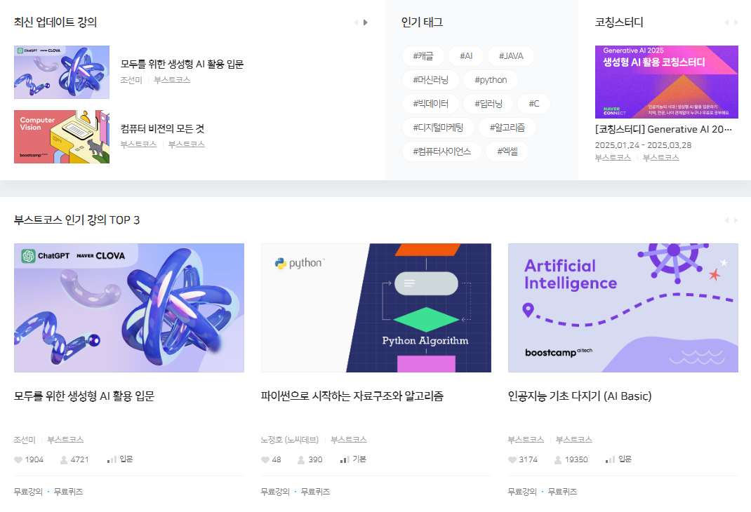 부스트코스는 네이버 커넥트재단이 만든 고품질 교육 플랫폼입니다. 인공지능, 데이터 분석, 웹 개발 등 실무에 강한 교육 과정으로 유명합니다.